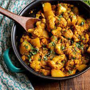 Aromatic curry of potatoes and cauliflower, cooked with onions, tomatoes,