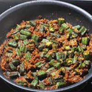 Tender okra cooked with onions, ginger, garlic, and tomatoes, creating